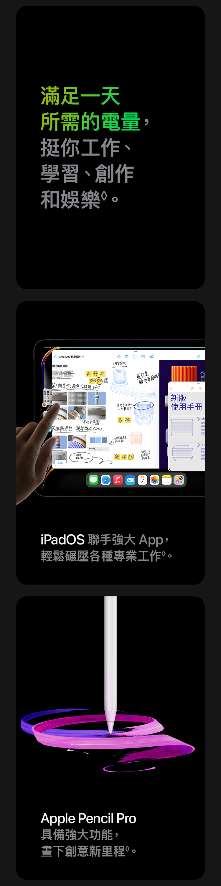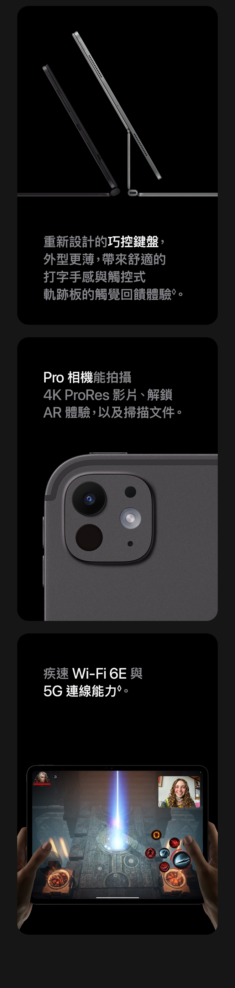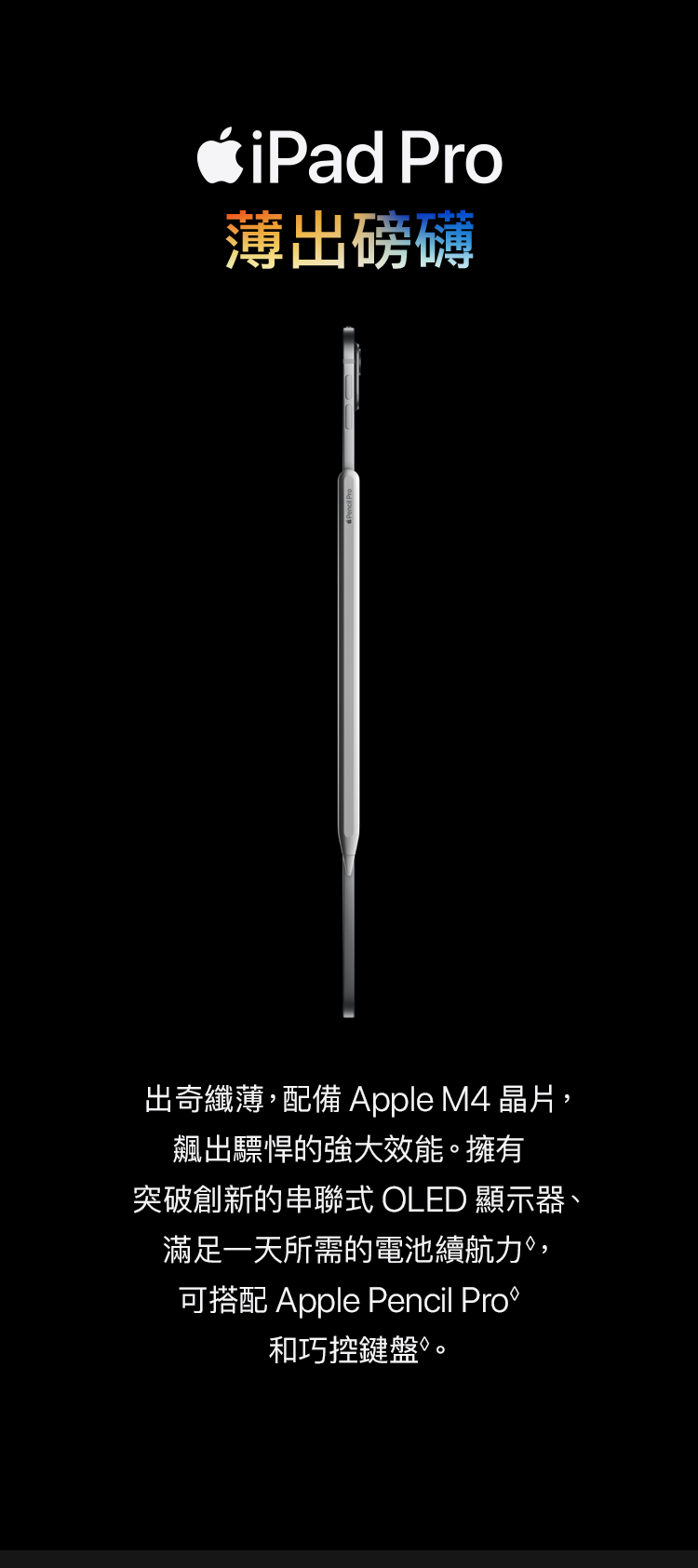 全新 iPad Pro 出奇纖薄,配備效能驃悍的 Apple M4 晶片、創新突破的 Ultra Retina XDR 顯示器,支援超飆速 Wi-Fi 6E 和 5G。搭配 Apple Pencil Pro 與巧控鍵盤,數不盡的多元用途、源源不絕的創造力和生產力,就在你指尖。